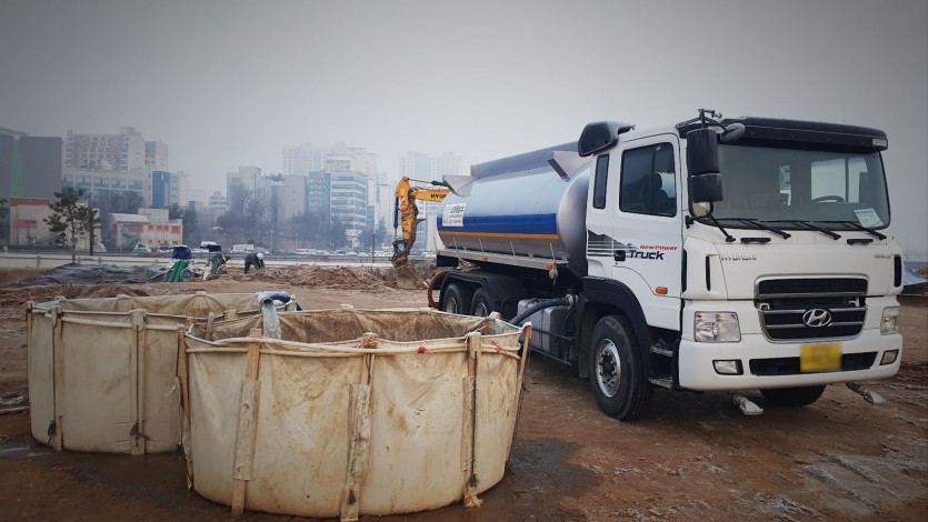 취수를 위해 현장을 나가고 들어올 때 도로 오염제거 살수도 병행합니다.