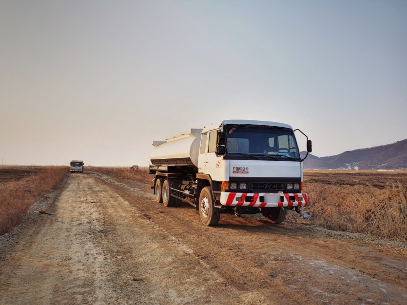 작업전 운행 구간을 충분히 적셔 놓으면 비산먼지 발생을 최대한 억제시켜 주변 민가의 피해(민원발생)를 예방할 수 있습니다.